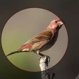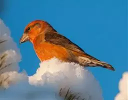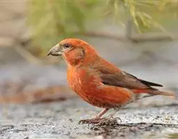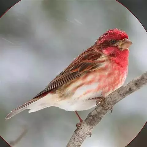 红腰朱雀:体长12-14厘米,小型鸟类。雄鸟前额和眉纹玫瑰粉红色,头顶和一宽的贯眼带深红褐色,背红…