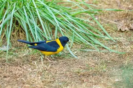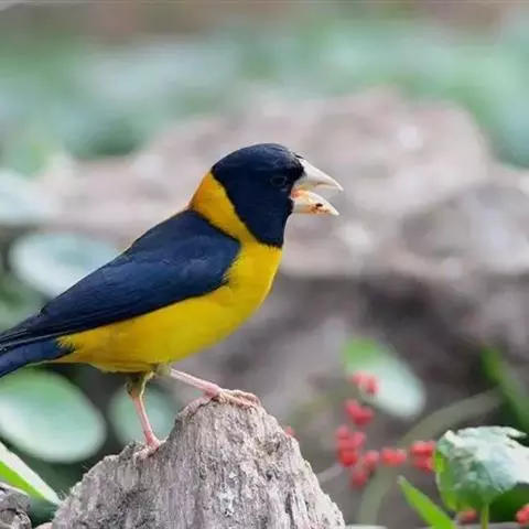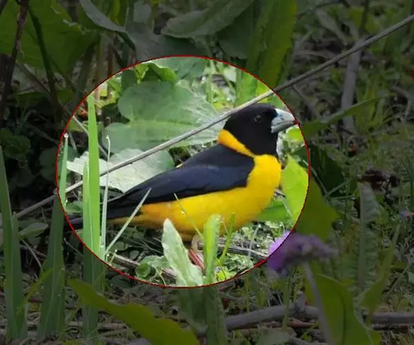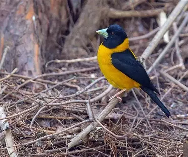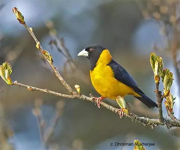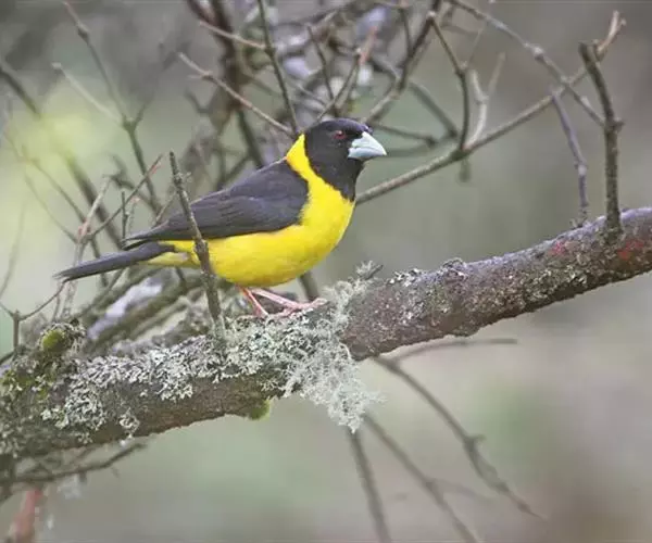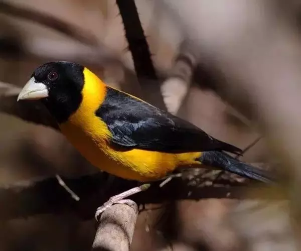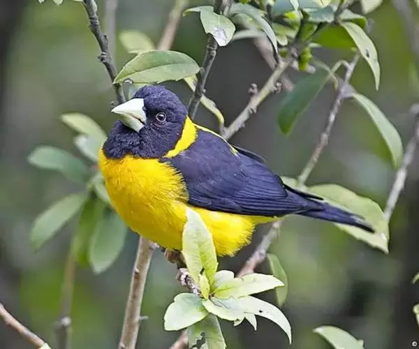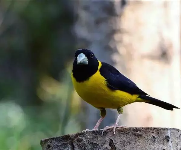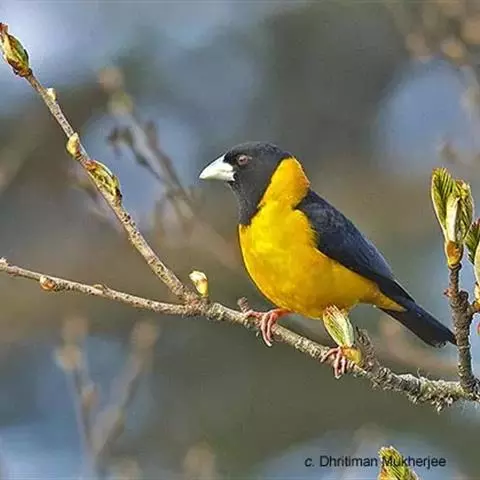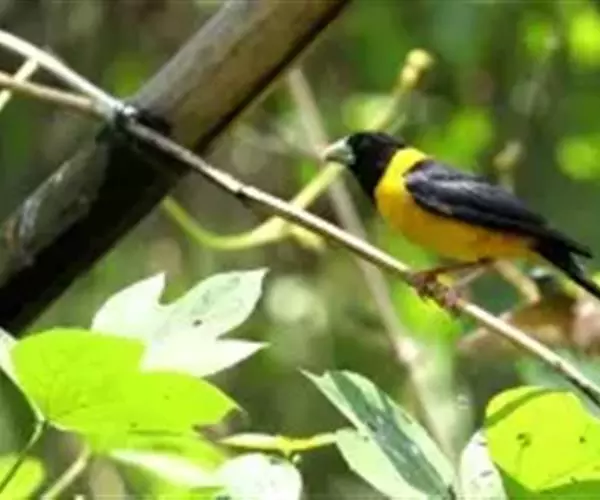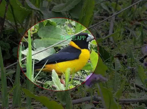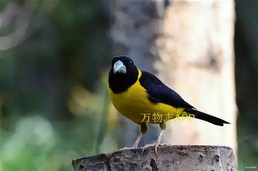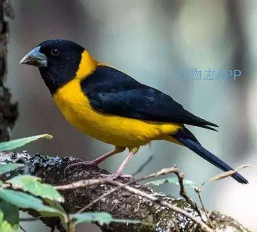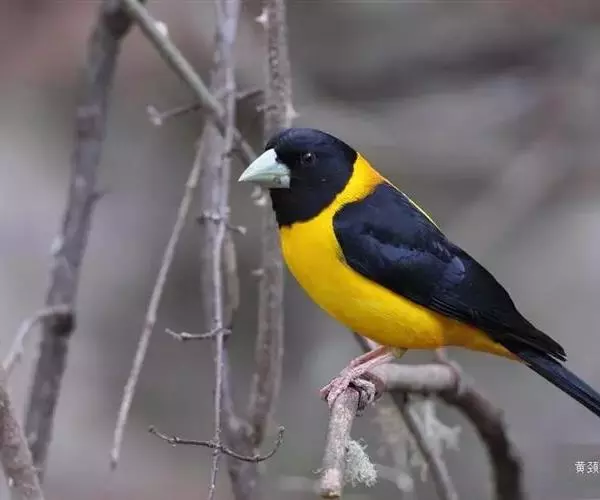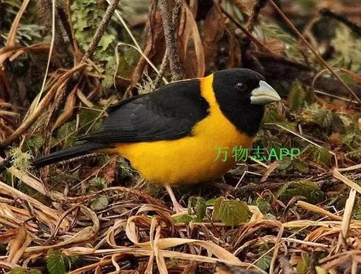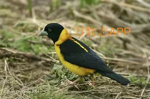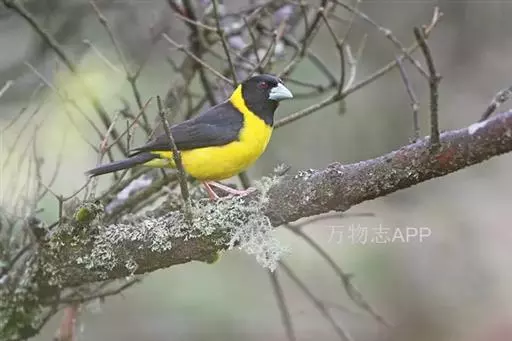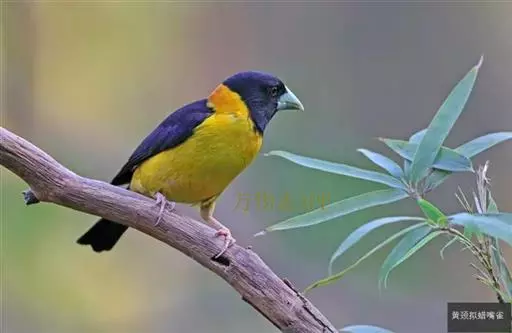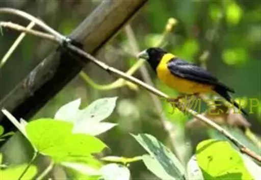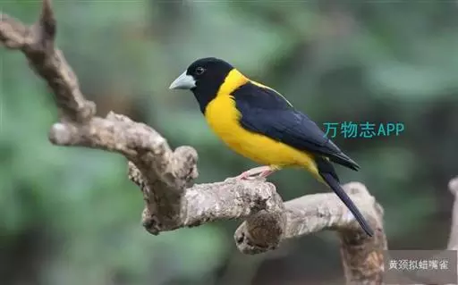 黄颈拟蜡嘴雀(学名:Mycerobas affinis):小型鸟类,体长20-22厘米。嘴粗大,黑色。雄鸟整个头、颈、颏、喉和上胸辉黑色,两翅和尾亦为黑色,其余上体橙黄色,下体鲜黄色。雌鸟头、颈、颏、喉和上胸中央灰色或暗灰色,背、肩和两侧覆羽橄榄绿色,腰黄色,两翅和尾黑色,下体橄榄黄色。