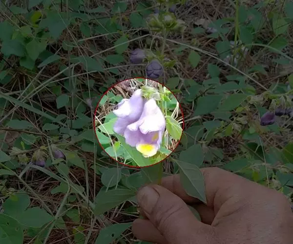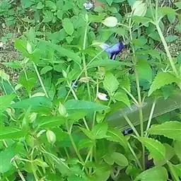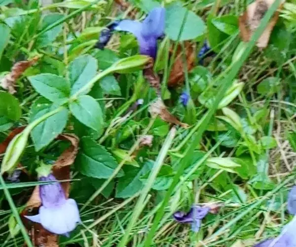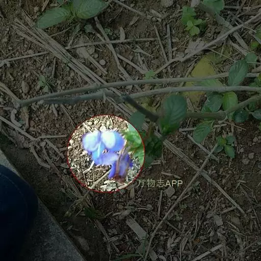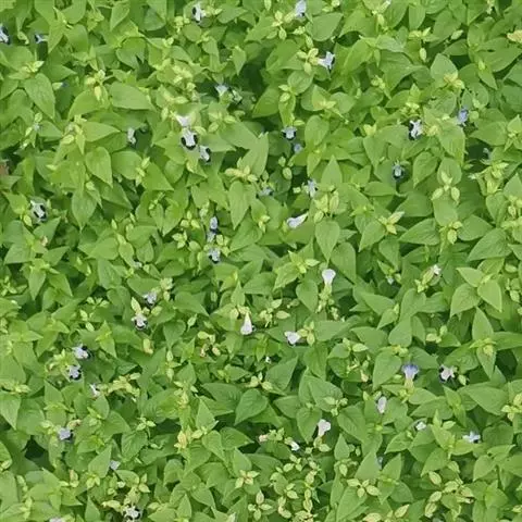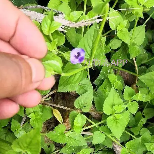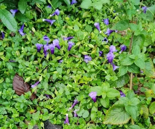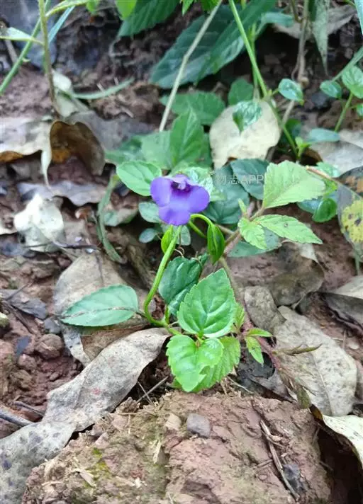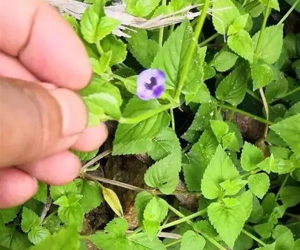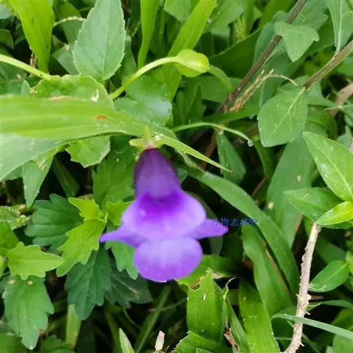 匍匐草本;茎具4棱,节上生根;分枝上升或直立。叶具长2-10毫米之柄;叶片三角状卵形或长卵形,稀卵圆形,长1-4厘米,宽0.8-2.5厘米,先端钝或急尖,基部宽楔形或近于截形,边缘具锯齿或具带短尖的圆锯齿,无毛或疏被柔毛。花具长2-3.5厘米之梗,果期梗长可达5厘米,单朵腋生或顶生,稀排成伞形花序;萼长1.2-1.5(1-7)厘米,果期长达2.3厘米,具5枚宽略超过1毫米之翅,基部下延;萼齿2枚,长三角形,果实成熟时裂成5枚小齿;花冠长2.5-3.9厘米,其超出萼齿部分长11-21毫米,蓝色或蓝紫色;前方一对花丝各具1枚长2-4毫米的线状附属物。花果期5-11月。 [1-2]