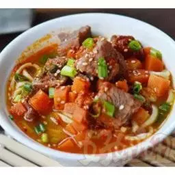 【材料】:番茄(适量),五花肉两个,面条若干,玉米粒适量,菠菜汁适量,胡萝卜汁适量,清水适量,洋葱半个,甜面酱20g,大酱60g,白砂糖4勺。