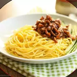 3.面条煮熟,捞出过一遍冷水,沥干水分,加入炸好的肉酱,加些黄瓜丝就可以吃了(也可以加些豆芽,随自己喜欢)。