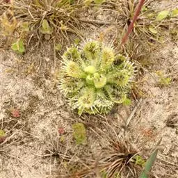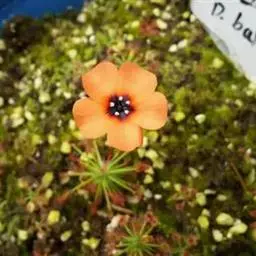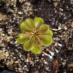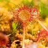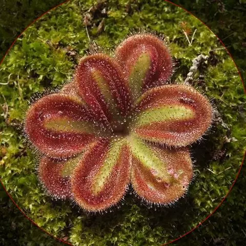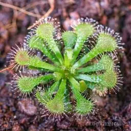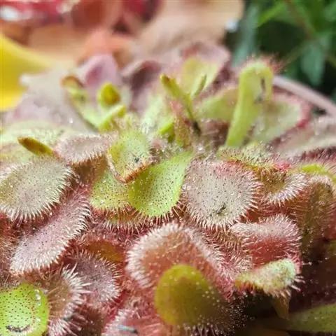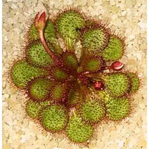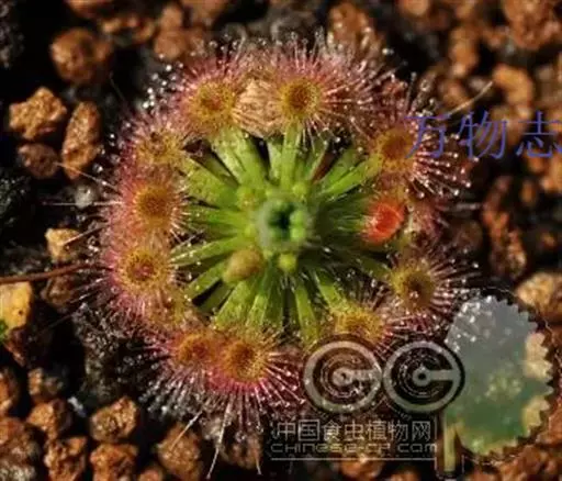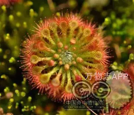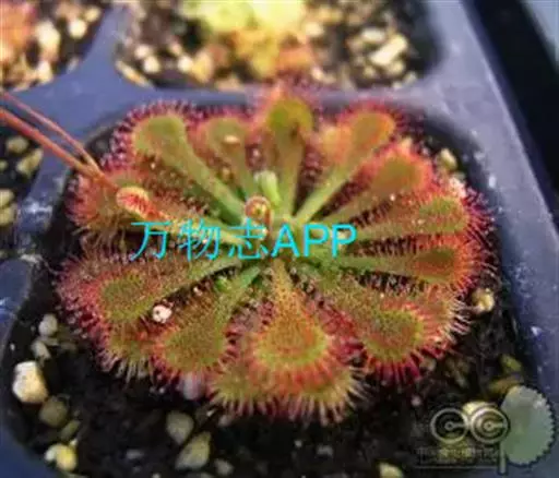 迷你茅膏菜学名圆叶茅膏菜(Drosera rotundifolia L.),又名毛毛苔、迷你毛毡苔和迷你茅膏菜,茅膏菜科植物。多年生草本,茎短,叶基生,叶片圆形或扁圆形,螺状聚伞花序1-2条,腋生,花葶状,纤细,直立,蒴果,熟后开裂为3果爿,种子多数,椭圆球形,花期夏、秋季,果期秋、冬季。茅膏菜不能适应寒冷或暴晒等自然环境,对恶劣的环境没有很强的抵御能力,寒冷与炎热地带不适宜生存。圆叶茅膏菜产于我国吉林和黑龙江,欧洲中部和北部、亚洲和美洲北部等寒冷地带也有分布,常生于海拔900-1000米的山地湿草丛中。圆叶茅膏菜全草可作支气管炎祛痰药。