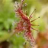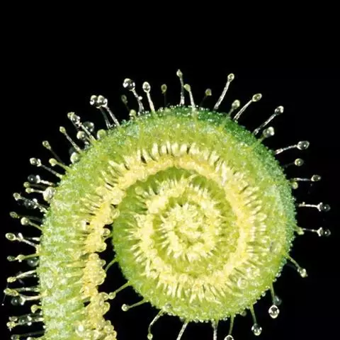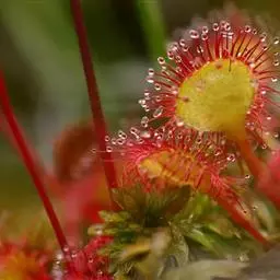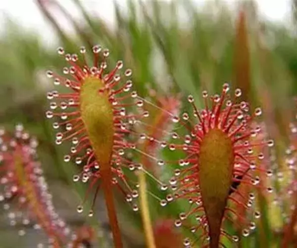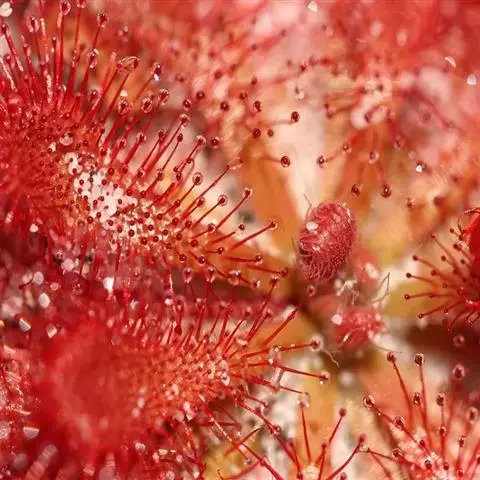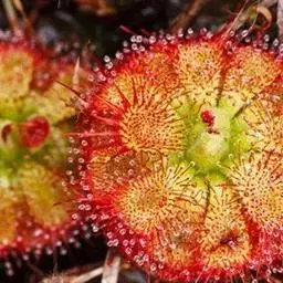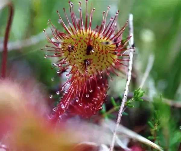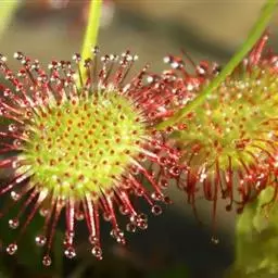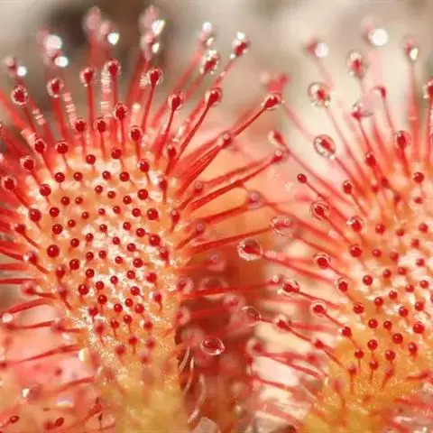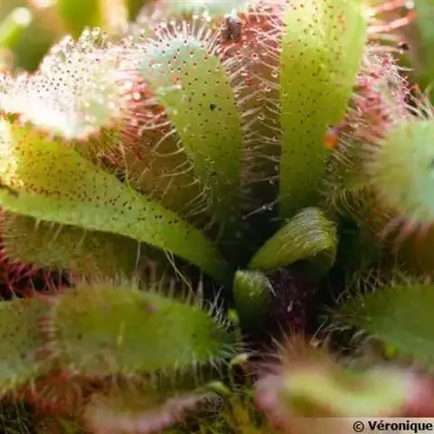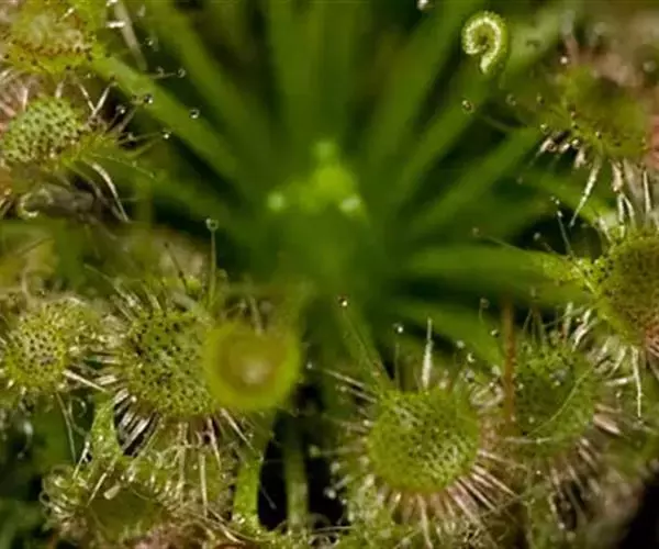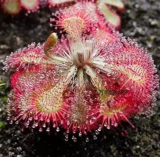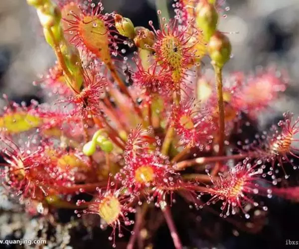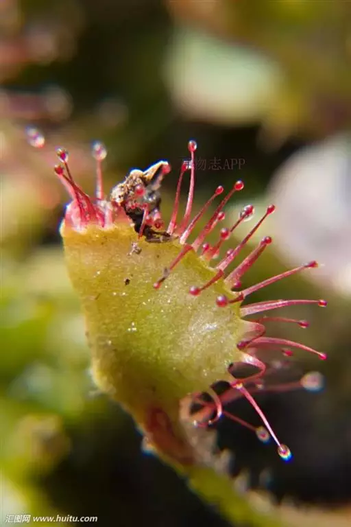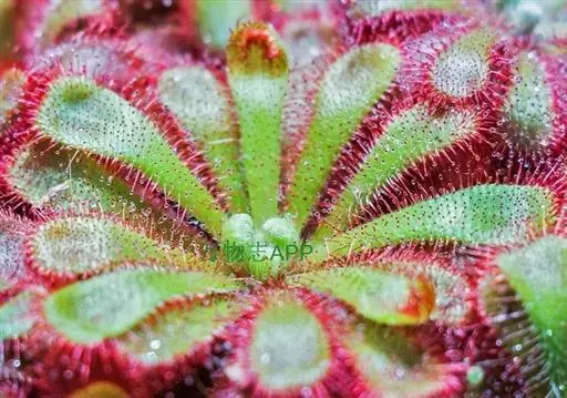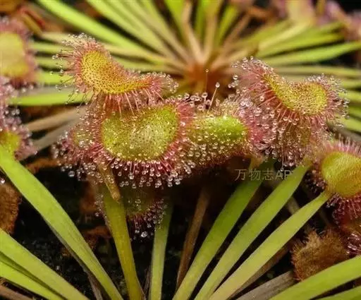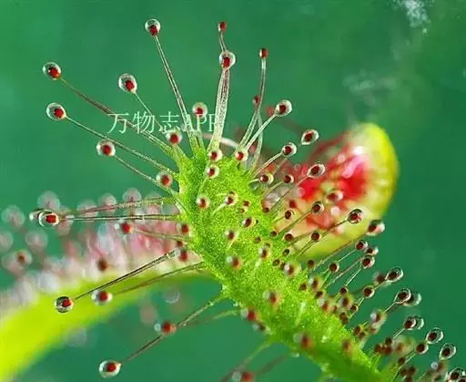 茅膏菜的叶上长着象露珠一样晶莹剔透的腺毛,这就是她们的捕虫器。就在腺毛的顶端有一个球状体,时常呈现出鲜艳的色彩,大多为红色,上面布满腺体,能分泌吸引昆虫的蜜汁与粘液的混合物和消化酶,外表就象是嵌有红宝石的水晶,如此的精美都无法想象这就是昆虫的死亡陷阱。当挡不住诱惑的昆虫来采食时,却发现自己已被粘住,恐慌中竭力的挣扎,结果周围的腺毛一起弯过来,有时叶片也会随之卷起,粘的更牢了。无法逃脱的昆虫被这些腺毛消化吸收,等消化吸收完全后,叶片和腺毛又重新展开,等待新的猎物。