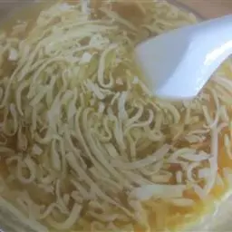 在碗内放熟猪油7.5克、白酱油15克和少许青蒜花,捞入面条,舀入沸滚的鱼汤即成。