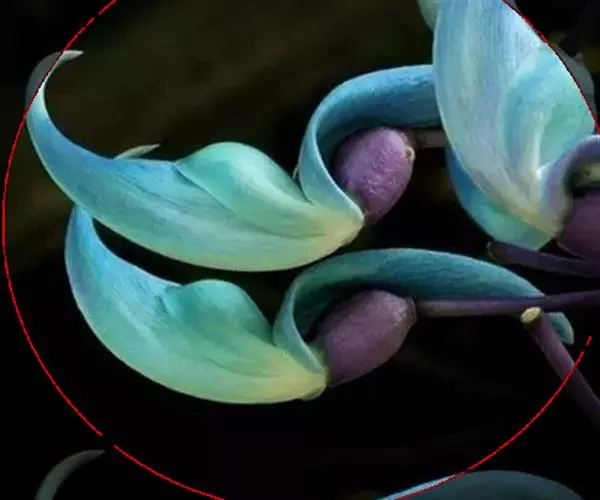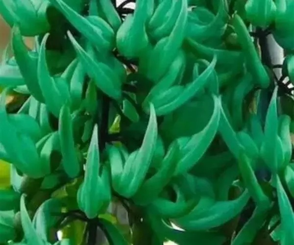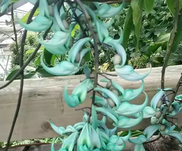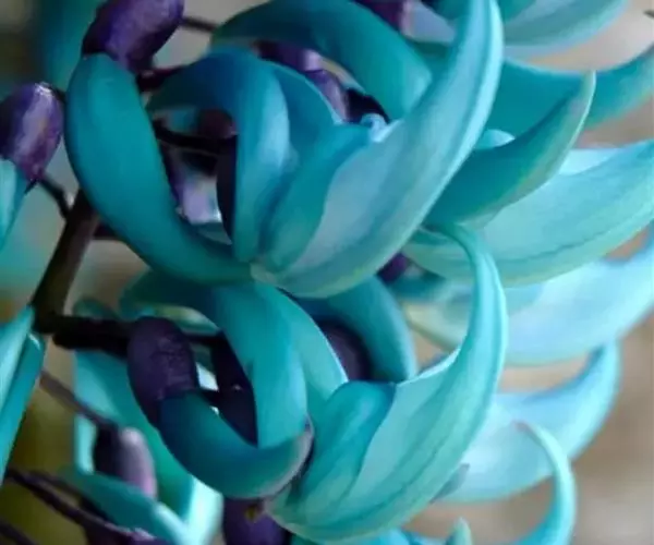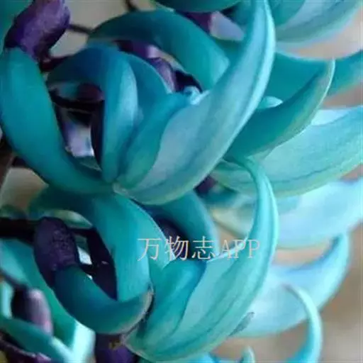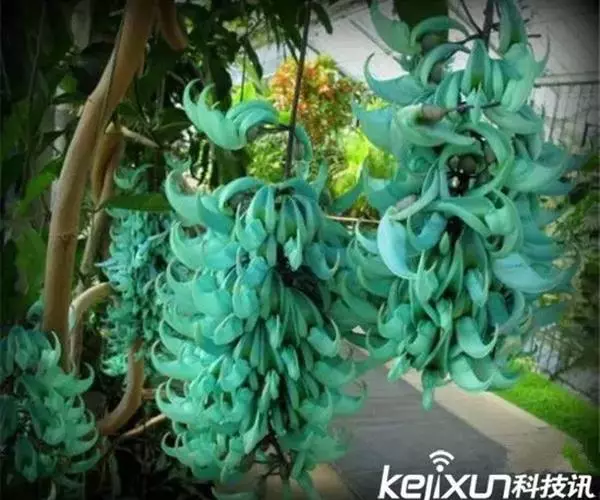翡翠葛花形奇特,花色稀有,盛花时节犹如百鸟归巢,蔚为壮观。暮春至初夏,花朵沿着花梗呈平展状生长,每一串花有数十朵,花碧玉色透蓝色光泽,龙骨瓣向上翘起,呈鹦鹉喙状,每一朵盛开的花像是一只翡翠雕琢而成的小鸟。花儿一串挨着一串,一朵接着一朵,犹如一群鸟儿振翅起飞。