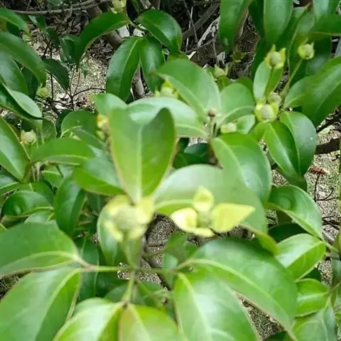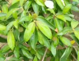 常绿乔木或灌木,高4-12米;树皮灰色或灰褐色,平滑;幼枝灰绿色,被白贴生短柔毛,老枝灰褐色,近于无毛。冬芽小,圆锥形,密被白色细毛。叶对生,革质,长圆椭圆形,稀卵状椭圆形或披针形,长7-9 (-12)厘米,宽2.5-4.2(-5)厘米,先端渐尖形,具尖尾,基部楔形或宽楔形,稀钝圆形,上面深绿色,嫩时被白色细伏毛,老后无毛,下面灰绿色,密被白色贴生短柔毛,中脉在上面明显,下面微凸起,侧脉通常3-4对,弓形内弯,有时脉腋有簇生白色细毛;叶柄细圆柱形,长8-12毫米,嫩时被细毛,渐老则近于无毛。