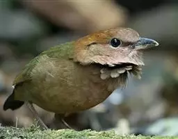 栗头八色鸫(学名:Pitta oatesi)又叫锅巴雀,体长为24-26厘米,体重100-135克,是雀形目八色鸫科的鸟类。体型圆胖,尾短,腿长,常在森林底层或低植被中找食无脊椎动物。叫声简单哀婉。头部栗褐色;前额、两颊、颈侧、喉至上胸渲染粉红色;上体、尾表暗绿,腰沾蓝色,上背栗褐色。下体茶黄,肛周呈棕白色。上嘴黑色,下嘴黄褐色;眼虹膜棕红或红褐色;跗蹠灰白色或角褐色。
