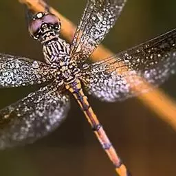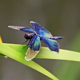 体黑色具蓝色金属光泽,腹部较为粗短,前翅前端1/3与后翅前端小部分透明,其余部分均呈黑色,且具蓝色闪光,又因后翅宽大如蝶翅,飞行时具有类似蝴蝶而非蜻蜓通常的飞行方式,故有“蝶形蜻蜓”之称。此种蜻蜓飞行缓慢。腹长约27mm,翅展约70mm。