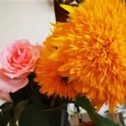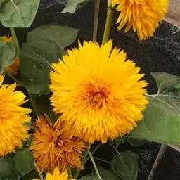 “Sonja”有着中等大小,4英寸的金橙色花,带着黑色的芯。它适合在小一点的花束中作为向日葵的点缀。“玩具熊”是另一种新奇的品种。它是一种矮小的品种,有着丰富的橙色花瓣,使得它有一种有些模糊的外表。“Floristan”是一种双色的品种,有着青铜色和红色的花朵,黄色的花尖和黑色的芯。“Prado Red”有着黑色的芯,周围包围着的是略带红的褐黄色花朵,直径约4英寸。其它带有这种丰富的、秋季的颜色有“秋季美”和“落日的余辉”。每个种类的向日葵代表的意义在不同的国家也有不同的寓意。