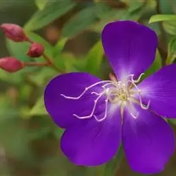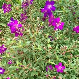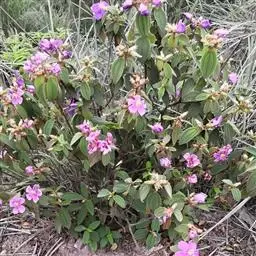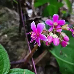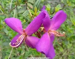 伞形花序或聚伞花序,或由聚伞花序组成的圆锥花序,顶生,总梗长1-5.5厘米,花梗长0.8-2厘米;花萼钟状漏斗形,管长5-7毫米,裂片线状披针形至狭三角形,长4-5毫米,两面均被毛;花瓣紫色或紫红色,卵形至广卵形,顶端渐尖,有时顶尖具1腺毛,微偏斜,仅外面上部及边缘被微柔毛,长10-14毫米,宽6-8毫米,雄蕊等长,长1.6-1.8厘米,花药披针形,通常作近90度的膝曲,长9-11毫米,药隔膨大,下延,前后连成盘状;子房卵形,顶端具膜质冠,冠缘具啮蚀状细齿。