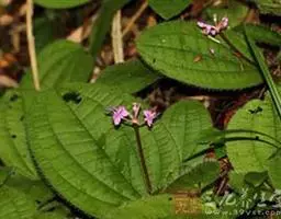 ,为桃金娘目、野牡丹科、锦香草属小灌木、半灌木或近草本,高20-50厘米,或达1米,茎幼时四棱形,不分枝或极少分枝,上部与叶柄、花序、花梗及花萼均密被柔毛及长腺毛。喜生长在荫蔽的环境和湿润肥沃的土壤中。产贵州、广西、广东(海南岛未发现)、浙江、江西、福建。全株供药用,有止痛、止血、祛瘀等功效;用于吐血、通经、跌打等症。煎水服治月经不调;叶捣碎加米汤及冬蜂蜜内服,治小儿疳积;全株捣碎外敷治烫火伤,煎水洗治疥疮。