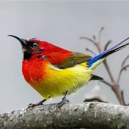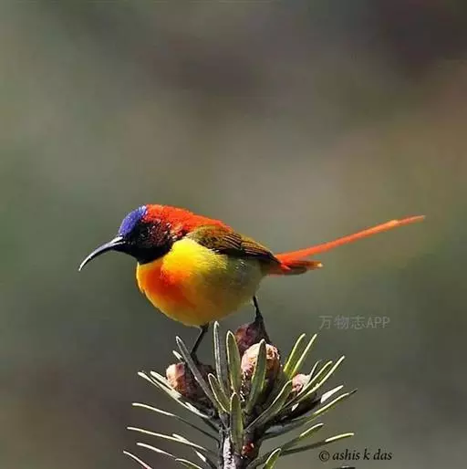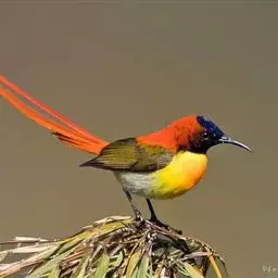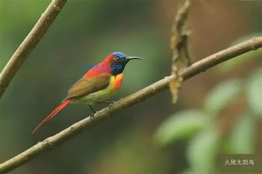 火尾太阳鸟(学名:Aethopyga ignicauda)为太阳鸟科太阳鸟属的鸟类。体长20厘米,色彩艳丽。雄鸟红色,具形长的艳猩红色中央尾羽。头顶金属蓝色,眼先和头侧黑色,喉及髭纹金属紫色。下体黄色,胸具艳丽的橘黄色块斑。雌鸟灰橄榄色,腰黄,体型比雄鸟小许多。虹膜褐色;嘴黑色;脚黑色。叫声为轻声颤音shweet。鸣声为单调的dzidzi-dzidzidzidzi声。