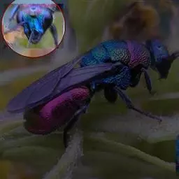 雄鸟前额,头顶辉蓝色,并由两侧向下延伸至整个颏、喉亦为辉蓝色,耳以后头顶两侧、枕、后颈、颈侧、背、肩和尾上覆羽概为火红色。中央一对尾羽概为火色,外侧尾羽外翈火红色,内翈褐色。腰亮红色,两翅褐色,飞羽羽缘橄榄黄色。眼先、颊、耳羽黑色,胸鲜黄色,胸中部缀有桔红色,腹和尾下覆羽淡黄沾绿色。