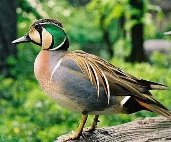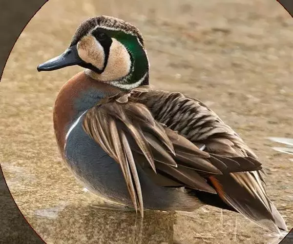 雄鸟繁殖羽头顶至后颈上部黑褐色,具淡棕色羽端。脸部自眼后有一宽阔的翠绿色金属带斑延伸至后颈下部;绿带与头颈部黑褐色之间有一白色狭纹,其余脸部呈乳黄色;在绿色带斑与乳黄色斑之间夹有黑色细线,并向颈侧下方延伸;黑色线与黄色脸斑之间还有白色细线;眼周黑色,并有一黑纹自眼周向下至喉部,从而将脸部乳黄色斑分割为前后两块。上背和两胁蓝灰色,密布以黑褐色波状细纹;下背至尾上覆羽暗褐色,具淡色羽缘;尾上覆羽尤淡,尾羽褐色,具细狭的棕白色羽缘;肩羽长而细,内翈棕白色,外翈绒黑色,具宽的棕红色羽缘。翅上覆羽暗褐色,大覆羽具宽的棕色端斑,形成翼镜前面棕色边缘。翼镜铜绿色,后面转为黑色,再后白色。颏、喉和前颈上部黑褐色,胸淡棕色,满杂以暗褐色点状斑,下胸两侧各具一宽阔的白色横带。腹白色,尾下覆羽黑褐色,中部具棕白色端斑,两侧具暗棕色羽缘,尾下覆羽两侧前面各有一白色宽带。腋羽白色。非繁殖羽似雌鸟。