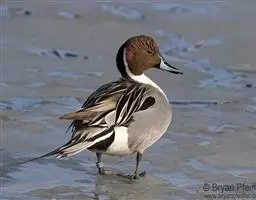 雌鸟上体暗褐色,羽缘稍淡。头顶褐色较浓,近黑色,密缀以棕色羽端。翅上翼镜较雄鸭为小,且铜绿色辉亮光泽亦差。头侧和颈侧白色,杂以暗褐色细纹,眼先在嘴基处有一棕白色或白色圆形斑,眼后上方具棕白色眉纹;颏棕白色,喉与前颈白色。胸与雄鸭相似,但斑点较少,腹亦为白色,下腹中央微具淡褐色粗斑,两胁暗褐色,具浅棕色羽缘;尾下覆羽白色,具褐色羽干纹。