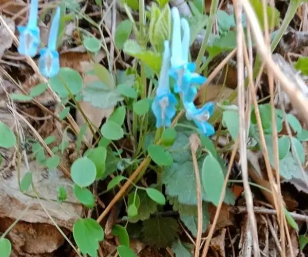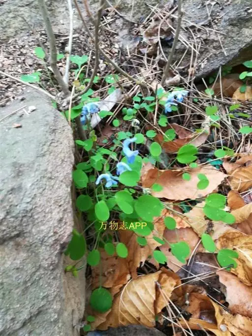 花蓝色或紫蓝色。上花瓣长约2厘米,瓣片较宽展,顶端微凹;距圆筒形,弧形上弯,长(1-)1.2-1.4厘米;蜜腺体约贯穿距长的3/4,顶端钝。下花瓣长约1厘米,瓣片宽展,微凹,基部具宽大的浅囊。内花瓣长7-8毫米。柱头四方形,上端具4乳突,下部具2尾状的乳突。
