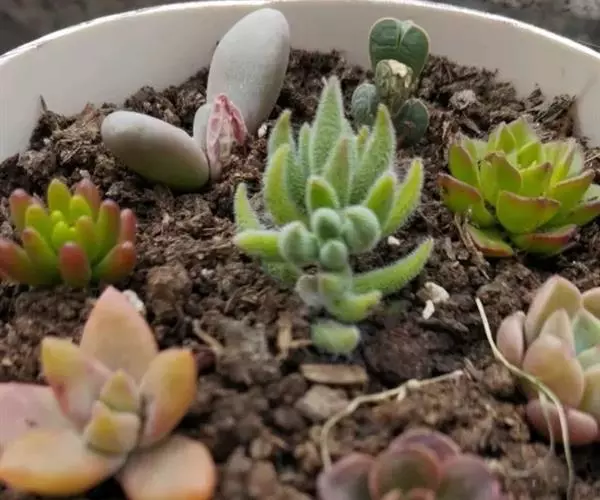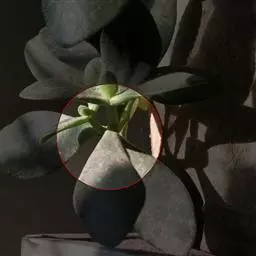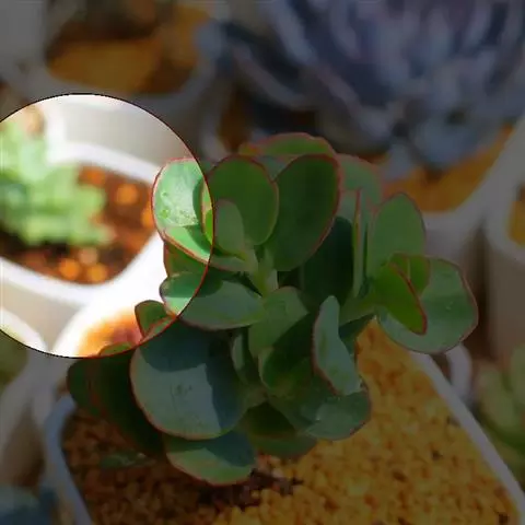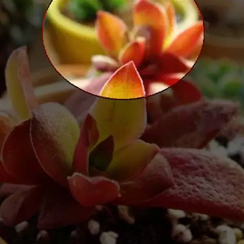 叶子表面宽厚,富肉质感且带有磨纱质感,看像石头质地;开红色小花,生于植株顶部,倒伞形密生,形状像花…