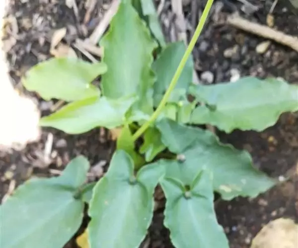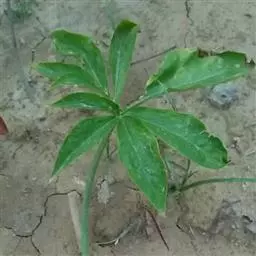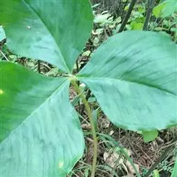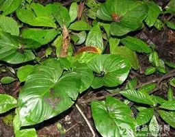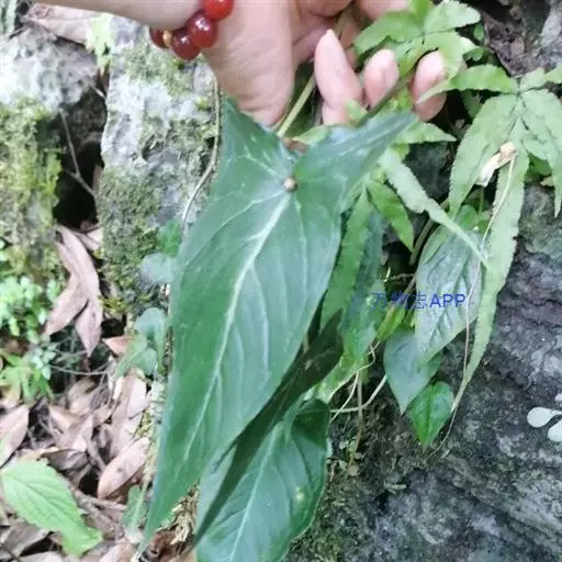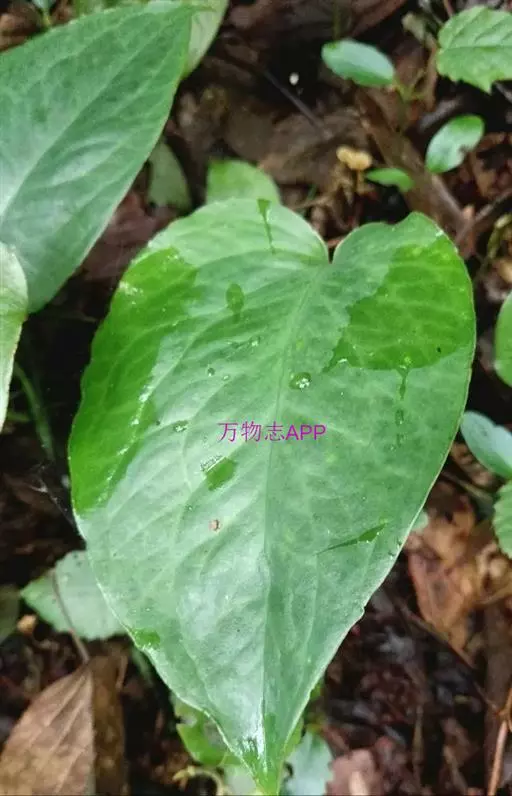 块茎球形、卵球形至长圆形,长2-4厘米,粗1-1.8厘米,表面密生多数须根。叶1,叶柄长12-25厘米,常紫色或绿色具紫斑,几无鞘,下部及顶头各有珠芽1枚。幼株叶片心状长圆形,长4厘米,宽2厘米;多年生植株叶片心形、心状三角形、心状长圆形或心状戟形,表面绿色、暗绿色,背面淡绿色或红紫色,二面沿脉颜色均较淡,先端长渐尖,有时成尾状,基部心形;长6-25厘米,宽2.5-7.5厘米;后裂片圆形或锐尖,稍外展。