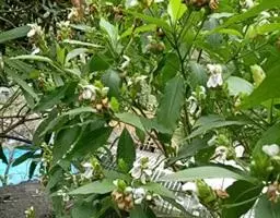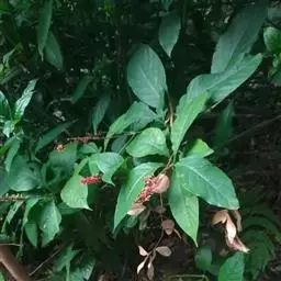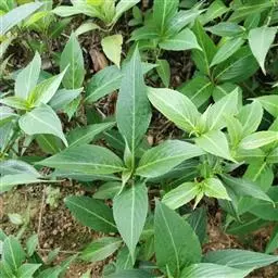 植株高2~3米,分枝多,枝条较柔 软。幼茎四棱形,绿色至深褐色。叶具短柄,对生,卵形至椭圆状,长4~5厘米,宽3.5~4厘米,先端渐尖,纸质,腹面深绿色,背面灰绿色,全缘。