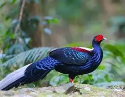 • 黑长尾雉大型鸡类,体长53~88厘米。雄较雌大。雄鸟通体紫蓝色,脸鲜红色,翅上有一条显著的白色翅斑…
