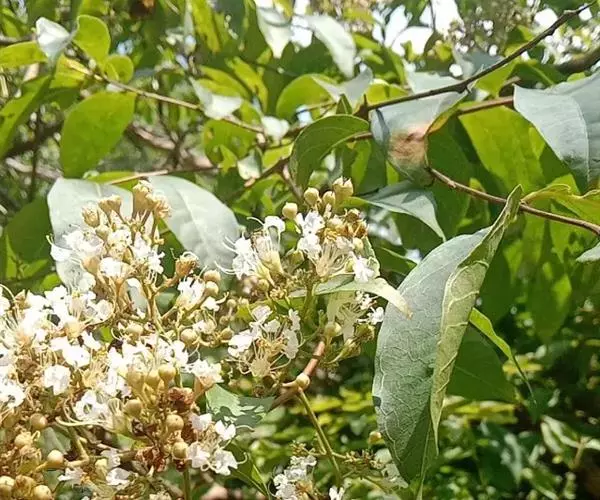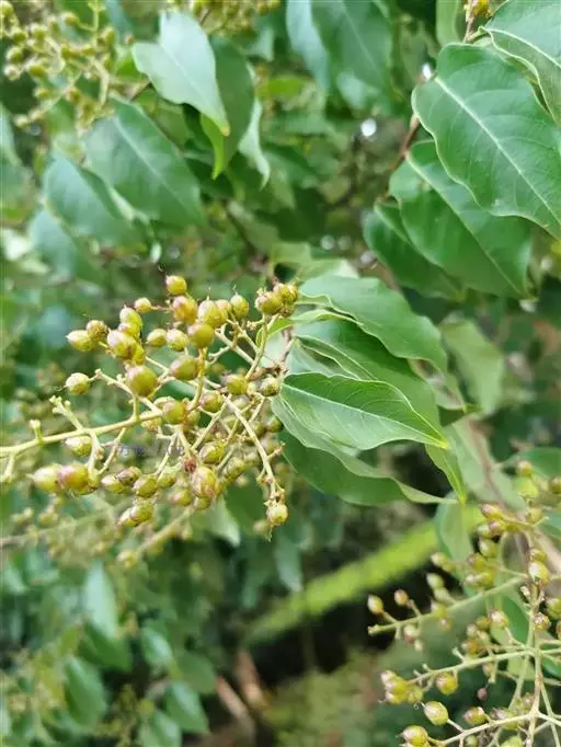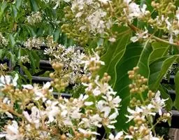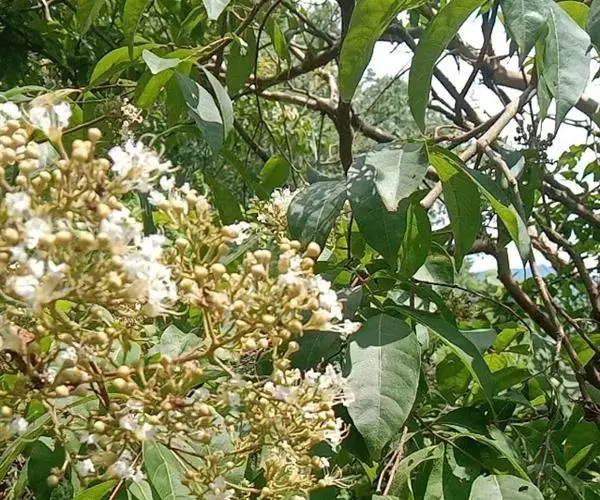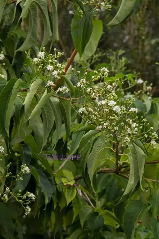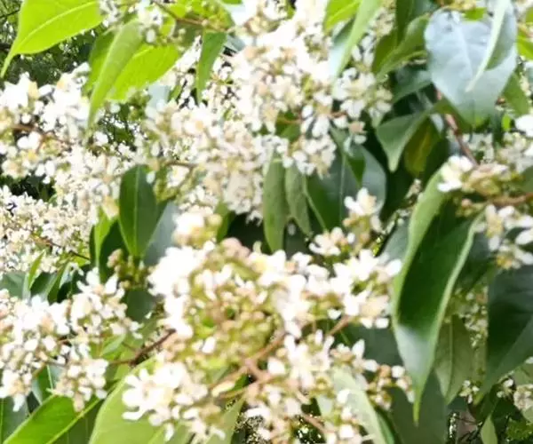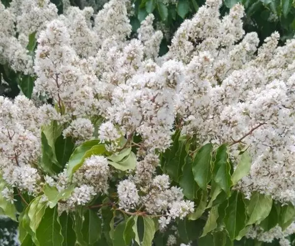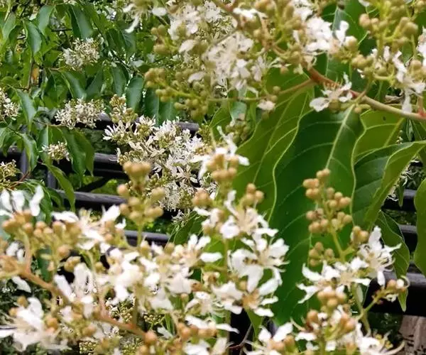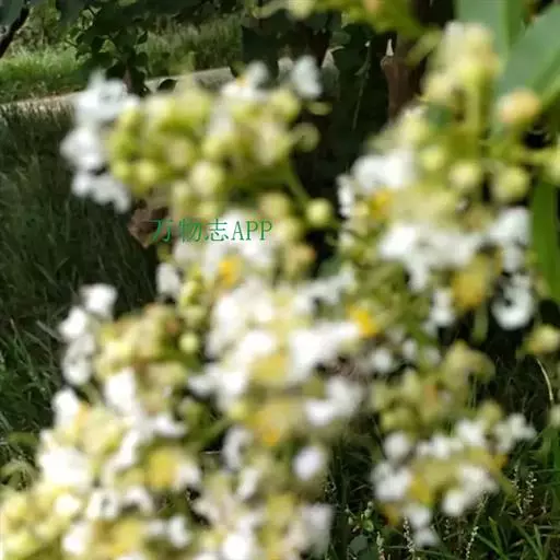 花小,白色或玫瑰色,直径约1厘米,组成顶生圆锥花序,长5-15厘米,具灰褐色微柔毛,花密生;花萼有棱10-12条,长3.5-4.5毫米,5裂,裂片三角形,直立,内面无毛;花瓣6,长2-6毫米,皱缩,有爪;雄蕊15-30,约5-6枚较长,12-14条较短,着生于萼片或花瓣上,花丝细长;子房无毛,5-6室。
