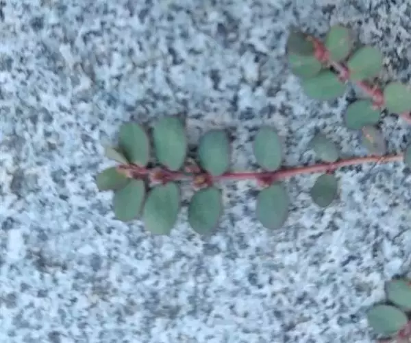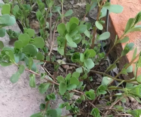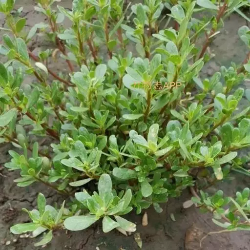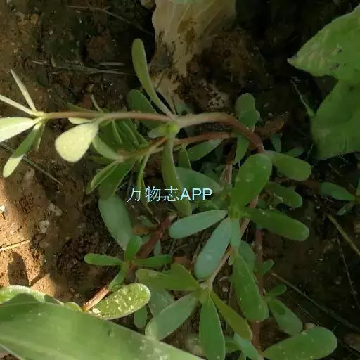 一年生草本,全株无毛。茎平卧或斜倚,伏地铺散,多分枝,圆柱形,长10-15厘米淡绿色或带暗红色。茎紫红色,叶互生,有时近对生,叶片扁平,肥厚,倒卵形,似马齿状,长1-3厘米,宽0.6-1.5厘米,顶端圆钝或平截,有时微凹,基部楔形,全缘,上面暗绿色,下面淡绿色或带暗红色,中脉微隆起;叶柄粗短。