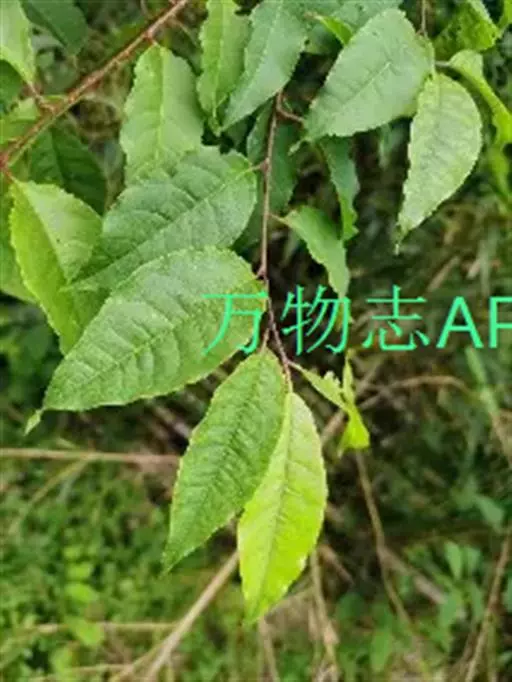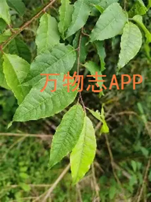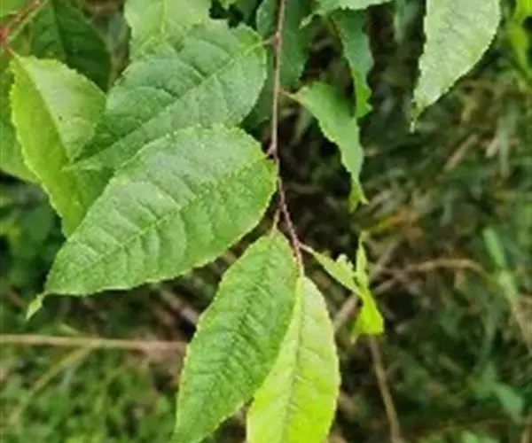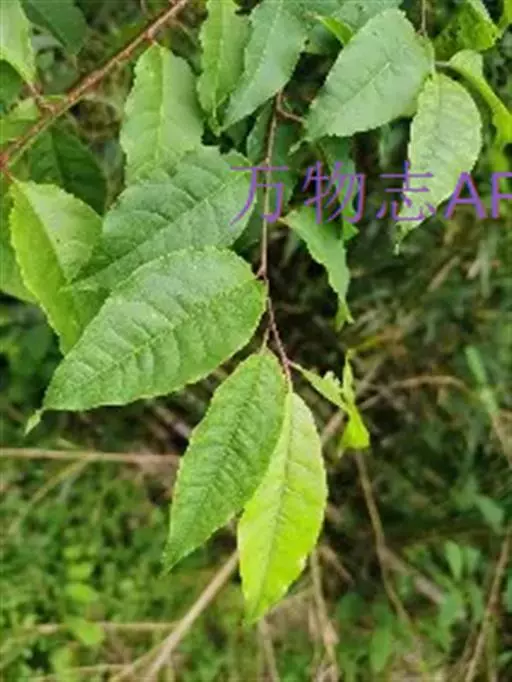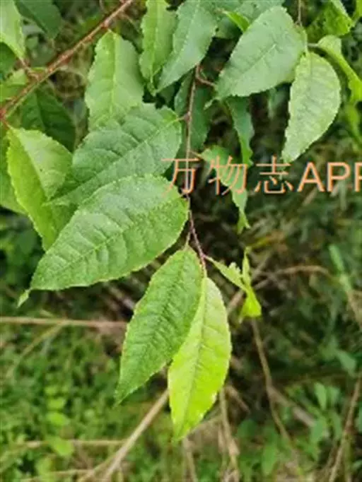 叶片椭圆形或长圆椭圆形,稀倒卵椭圆形,长4-10厘米,宽2.5-5厘米,先端尾状渐尖或短渐尖,基部圆形、宽楔形,偶有楔形,边缘有贴生锐锯齿,上面深绿色,下面淡绿色,两面无毛;叶柄长1-1.5厘米,通常无毛,无腺体,有时在叶片基部边缘两侧各有1个腺体;托叶膜质,线形,先端渐尖,边有腺齿,早落。