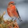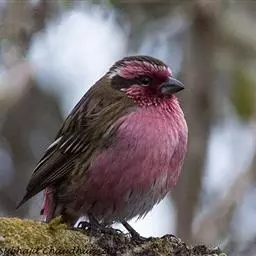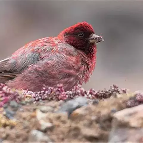 藏朱雀:全长约17-18厘米。雄鸟头部深红色具光辉,喉部暗红色具白色点斑;背部灰白色,各羽具玫瑰红…
