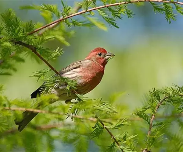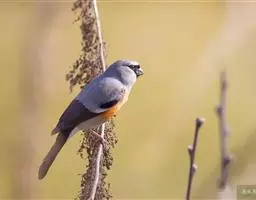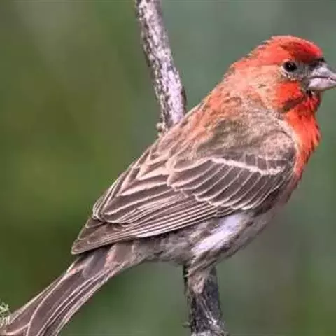 红腰朱雀:体长12-14厘米,小型鸟类。雄鸟前额和眉纹玫瑰粉红色,头顶和一宽的贯眼带深红褐色,背红…