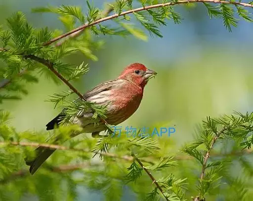 长尾朱雀:体长18厘米,体重16-26克。雄鸟额、颏和眼后为暗红色,…