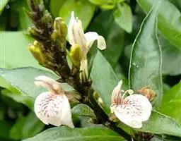 穗状花序紧密,稍弯垂,长6-9厘米;苞片砖红色,长1.2-1.8厘米,被短柔毛;萼白色,长约为冠管的1/4;花冠白色,在喉凸上有红色斑点,长3.2厘米,伸出苞片之外,冠檐深裂至中部,被短柔毛。蒴果未见。