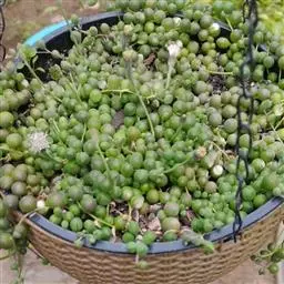 为多年生常绿匍匐生肉质草本植物。茎纤细,全株被白色皮粉。叶互生,较疏,圆心形,深绿色,肥厚多汁,极似珠子,故有佛串珠、绿葡萄、绿之铃之美称。头状花序,顶生,长3~4厘米,呈弯钩形,花白色至浅褐色。花期:12月至翌年1月。有微尖的刺状突起,绿色,具有一条透明的纵纹。花白色。