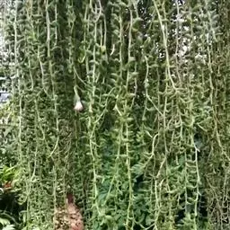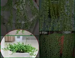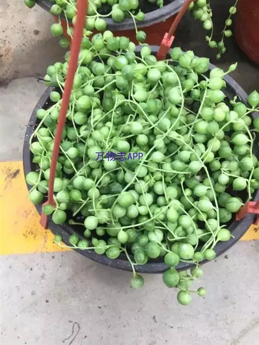 为多年生常绿匍匐生肉质草本植物。茎纤细,全株被白色皮粉。叶互生,较疏,圆心形,深绿色,肥厚多汁,极似珠子,故有佛串珠、绿葡萄、绿之铃之美称。头状花序,顶生,长3~4厘米,呈弯钩形,花白色至浅褐色。花期:12月至翌年1月。