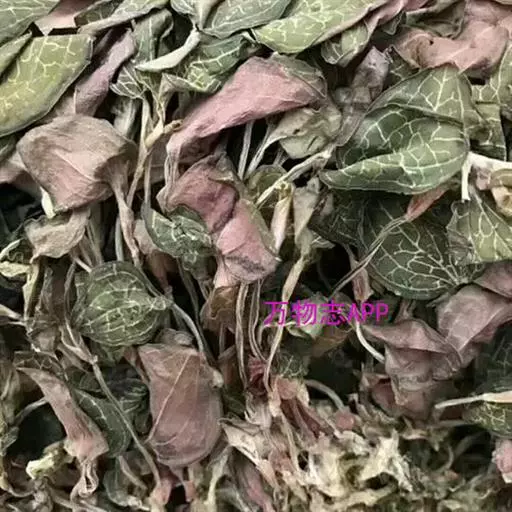 福建金线莲(Anoectochilus roxburghii) 呈皱缩卷曲,不规则状的干燥全草,根茎圆柱形,多弯曲,长1-5cm,表面棕褐色,茎节明显,有金黄色网状脉,下部集生2-4片叶,叶互生,多卷缩而完整,展开为宽卵形,表面黑棕色、下面暗红色,部分叶脉紫红色,主脉3~7条,叶柄基部鞘状抱茎,偶见总状花序顶生,花暗棕色,少见蒴果矩圆形,香气特异,味淡。其雄株于雌株略有差别,主要在于雌株的叶脉更为深,而雄株几乎见不到叶脉。