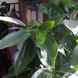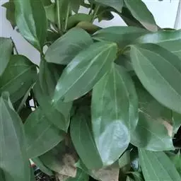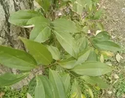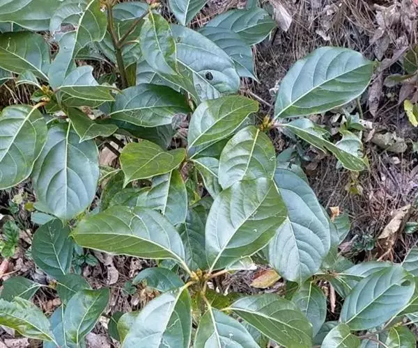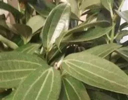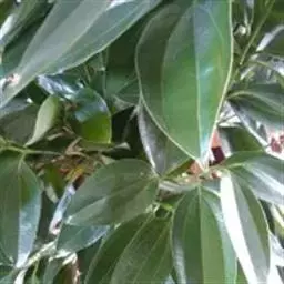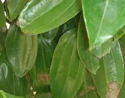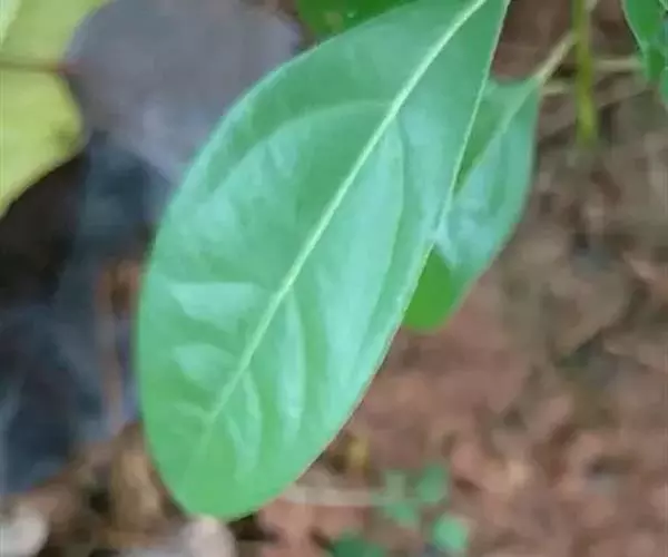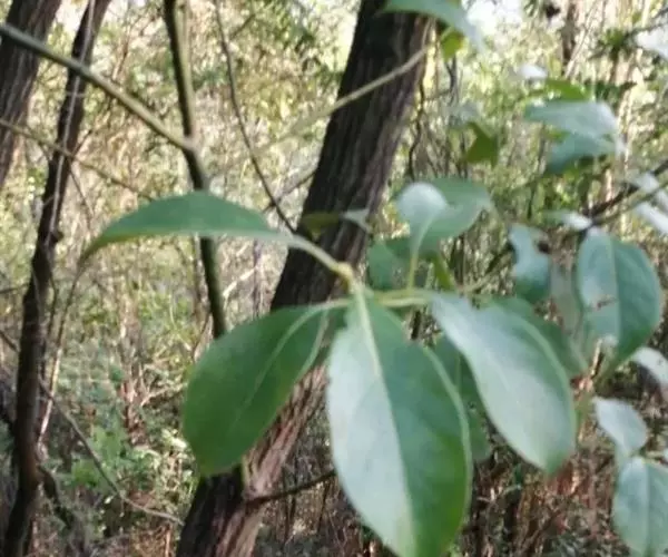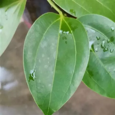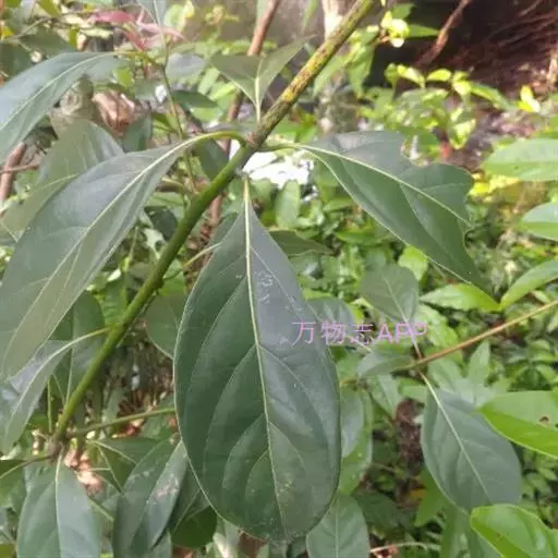 叶互生,通常为椭圆状卵形或长椭圆状卵形,长6-12厘米,宽3-6厘米,在花枝上的稍小,先端通常急尖或短渐尖,基部楔形或阔楔形,革质,上面深绿色,下面色稍浅,两面无毛或仅下面腺窝具毛簇,羽状脉,侧脉每边4-5条,与中脉两面明显,侧脉脉腋上面不明显凸起下面无明显的腺 窝,细脉和小脉网状;叶柄长1.5-3厘米,腹凹背凸,无毛。