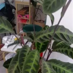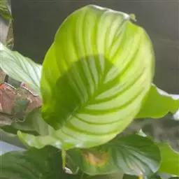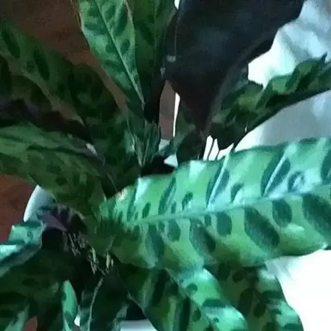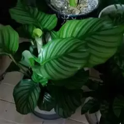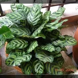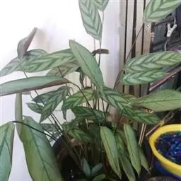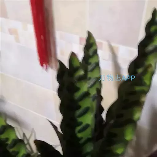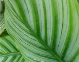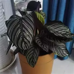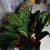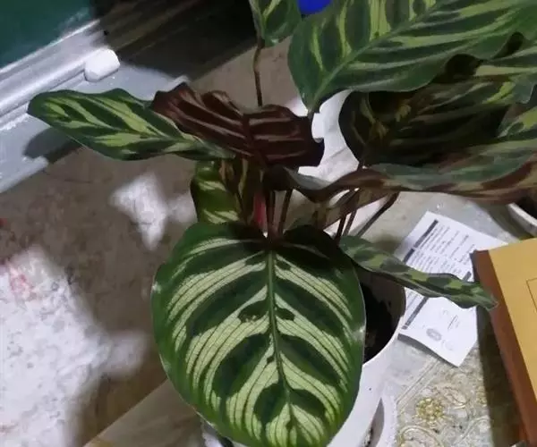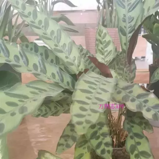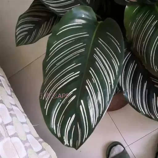 孔雀竹芋(学名:Calathea makoyana E. Morr.):竹芋科,肖竹芋属多年生常绿草本。植株挺拔株高可达60厘米。叶柄紫红色, 叶片薄革质,卵状椭圆形,叶面上有墨绿与白色或淡黄相间的羽状斑纹,就像孔雀尾羽毛上的图案,因而得名。叶片亦有特性:白天舒展,晚间折叠起来。