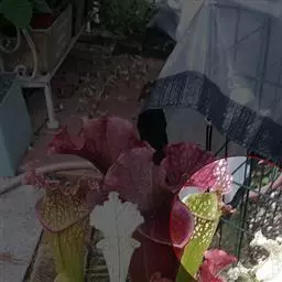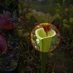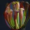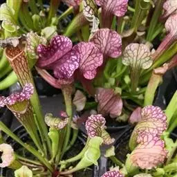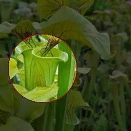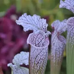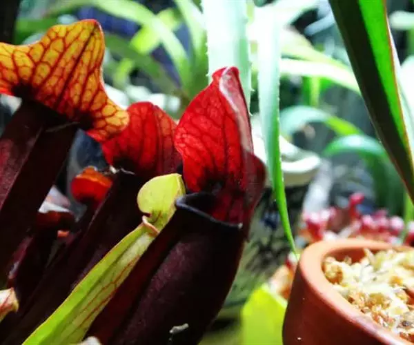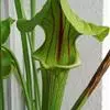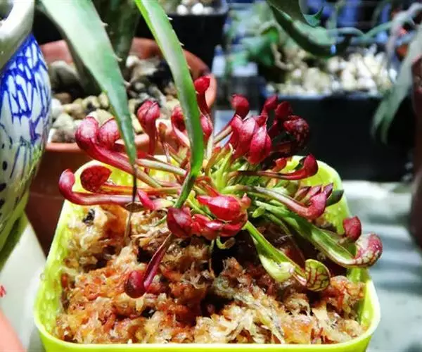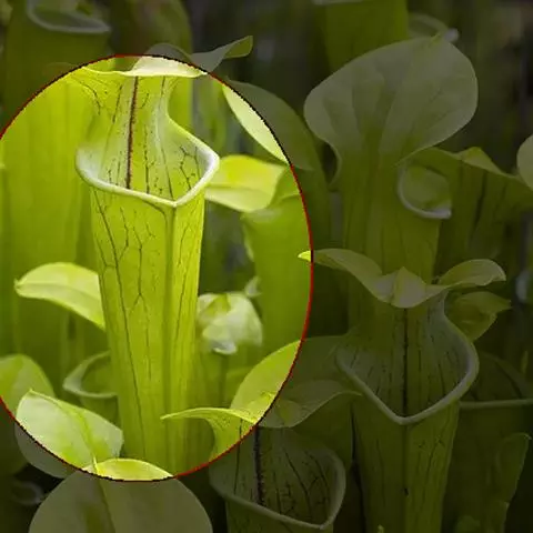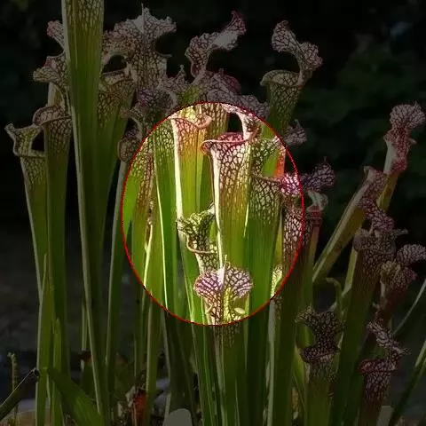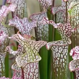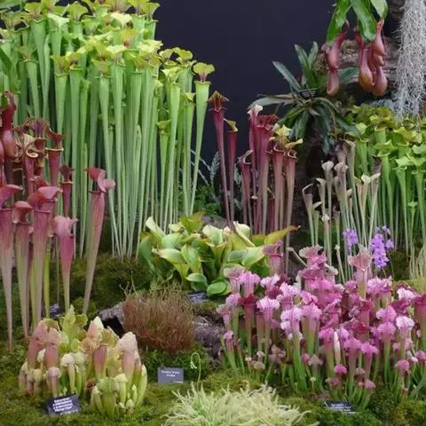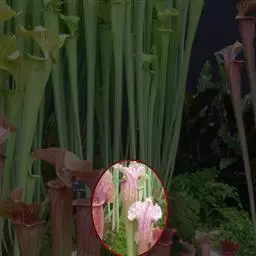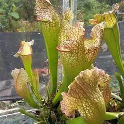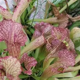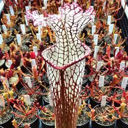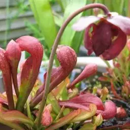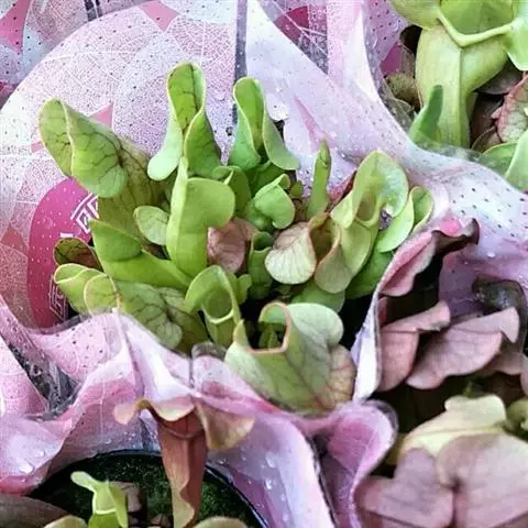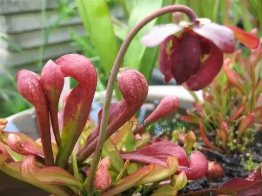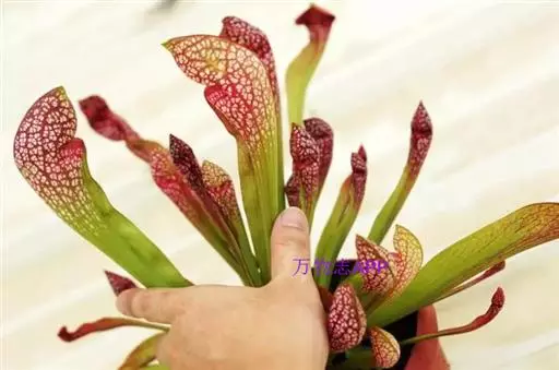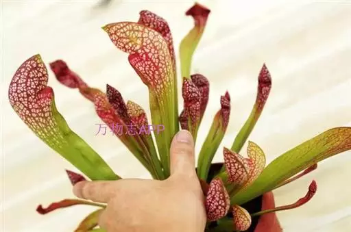 瓶子草是一种相对体形较大气质高雅的食虫植物,叶子成瓶状直立或侧卧,颜色 鹦鹉瓶子草 鲜艳,有绚丽的斑点或网纹,形态和猪笼草的笼子相似,能分泌蜜汁和消化液,受蜜汁引诱的昆虫失足掉落瓶中,瓶内的消化液会把昆虫消化吸收。