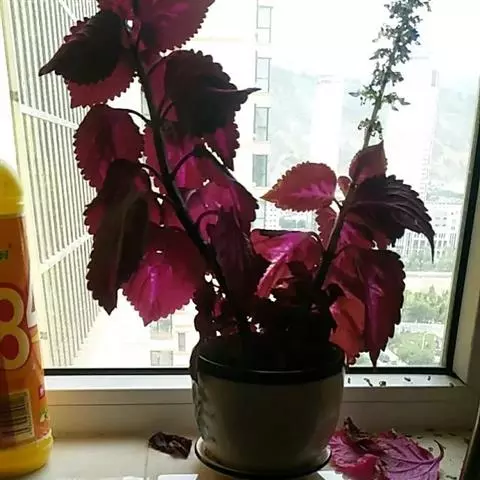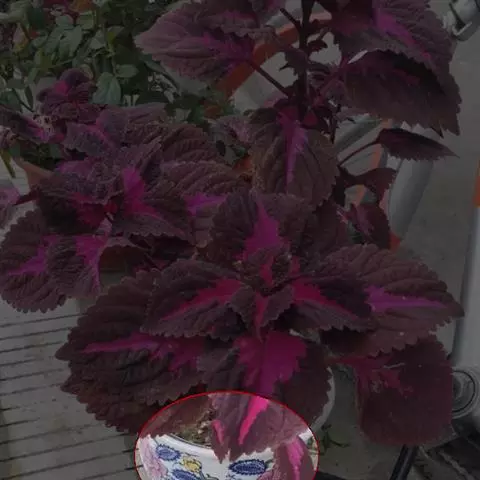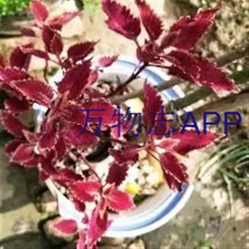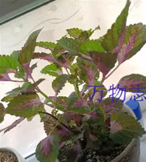 直立或上升草本。茎通常紫色,四稜形,被微柔毛,具分枝。叶膜质,其大小、形状及色泽变异很大,通常卵圆形,长4-12.5厘米,宽2.5-9厘米,先端钝至短渐尖,基部宽楔形至圆形,边缘具圆齿状锯齿或圆齿,色泽多样,有黄、暗红、紫色及绿色,两面被微柔毛,下面常散布红褐色腺点,侧脉4-5对,斜上升,与中脉两面微突出;叶柄伸长,长1-5厘米,扁平,被微柔毛。轮伞花序多花,花时径约1.5厘米,多数密集排列成长5-10(25)厘米、宽3-5(-8)厘米的简单或分枝的圆锥花序;花梗长约2毫米,与序轴被微柔毛;苞片宽卵圆形,长2-3毫米,先端尾尖,被微柔毛及腺点,脱落。花萼钟形,10脉,开花时长2-3毫米,外被短硬毛及腺点,果时花萼增大,长达7毫米,萼檐二唇形,上唇3裂,中裂片宽卵圆形,十分增大,果时外反,侧裂片短小,卵圆形,约为中裂片之半,下唇呈长方形,较长,2裂片高度靠合,先端具2齿,齿披针形。花冠浅紫至紫或蓝色,长8-13毫米,外被微柔毛,冠筒骤然下弯,至喉部增大至2.5毫米,冠檐二唇形,上唇短,直立,4裂,下唇延长,内凹,舟形。雄蕊4,内藏,花丝在中部以下合生成鞘状。花柱超出雄蕊,伸出,先端相等2浅裂。花盘前方膨大。小坚果宽卵圆形或圆形,压扁,褐色,具光泽,长1-1.2毫米。花期7月。