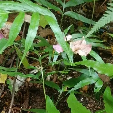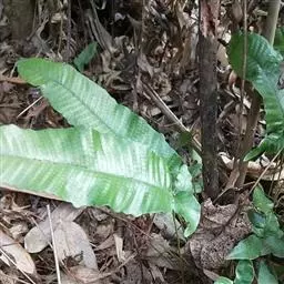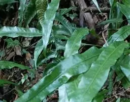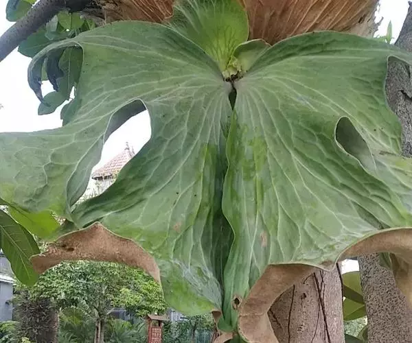 附生植物。根状茎肉质,短而横卧,密被鳞片;鳞片淡棕色或灰白色,中间深褐色,坚硬,线形,长10毫米,宽4毫米。叶2列,二型;基生不育叶(腐殖叶)宿存,厚革质,下部肉质,厚达1厘米,上部薄,直立,无柄,贴生于树干上,长达40厘米,长宽近相等,先端截形,不整齐,3-5次叉裂,裂片近等长,圆钝或尖头,全缘,主脉两面隆起,叶脉不明显,两面疏被星状毛,初时绿色,不久枯萎,褐色。