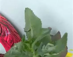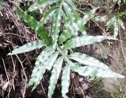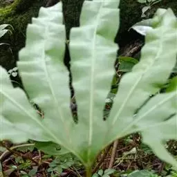 正常能育叶常成对生长,下垂,灰绿色,长25-70厘米。分裂成不等大的3枚主裂片,基部楔形,下延,近无柄,内侧裂片最大,多次分叉成狭裂片,中裂片较小,两者都能育,外侧裂片最小,不育,裂片全缘,通体被灰白色星状毛,叶脉粗而突出。