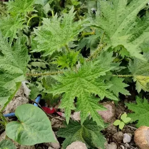 多年生草本,有横走的根状茎,茎自基部多出,高40~100厘米,四棱形,密生刺毛和被微柔毛,分枝少。叶近膜质,宽卵形、椭圆形、五角形或近圆形轮廓,长5~15厘米,宽3~14厘米,先端渐尖或锐尖,基部截形或心形,边缘有5~7对浅裂片或掌状3深裂(此时每裂片又分出2~4对不整齐的小裂片),裂片自下向上逐渐增大,三角形或长圆形,长1~5厘米,先端锐尖或尾状,边缘有数枚不整齐的牙齿状锯齿,上面绿色或深绿色,疏生刺毛和糙伏毛,下面浅绿色,被稍密的短柔毛,在脉上生较密的短柔毛和刺毛,钟乳体杆状、稀近点状,基出脉5条,上面一对伸达中上部裂齿尖,侧脉3~6对;叶柄长2~8厘米,密生刺毛和微柔毛;托叶草质,绿色,2枚在叶柄间合生,宽矩圆状卵形至矩圆形,长10~20毫米,先端钝圆,被微柔毛和钟乳体,有纵肋10~12条。