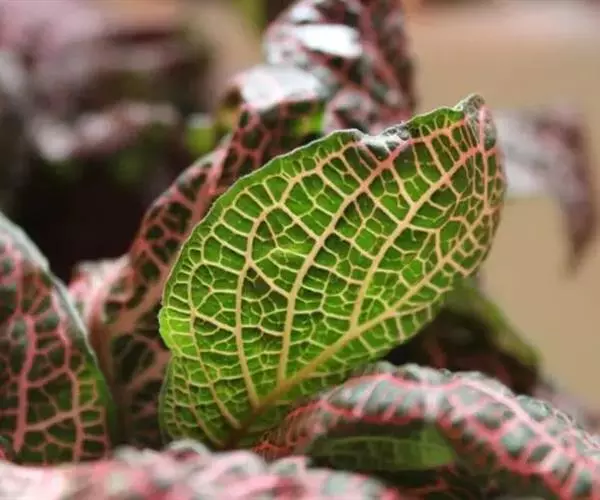 大火焰网纹草:大火焰网纹草的叶片娇小,卵形或椭圆形、叶缘褶皱,叶片平展、叶面深绿色、叶脉砖红色,羽状分布,十分清晰,为主要观赏性状。且姿态轻盈,植株小巧玲玫,叶色转红,纹理匀称,深受人们喜爱。