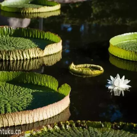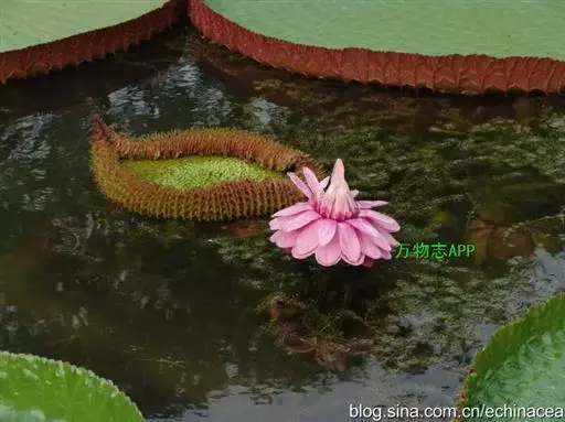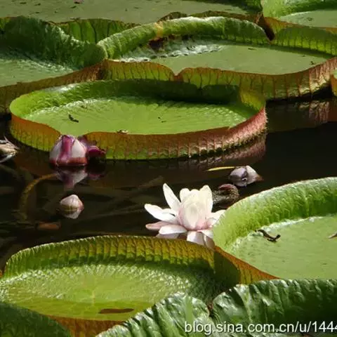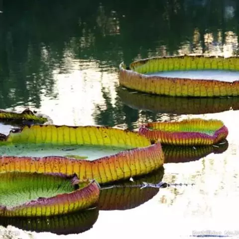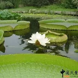 王莲是水景园中的瑰宝,口十片为圆形,叶片边缘向上卷曲,整个叶面浮于水面,十分奇特。王莲的单花花期仅三天,每天的颜色还不相同,开花时花蕾伸出水面,第一天开白色并伴有芳香,第二天变为粉红色,第三天则变为紫红色,然后闭合沉入水中,种子在水中成熟。 王莲主要有‘克鲁兹’王莲和‘亚马逊’王莲2个栽培种,‘克鲁兹’王莲的耐寒性、抗逆性较‘亚马逊’王莲强,栽培也较为容易,北方地区多引种 和栽培此种。‘克鲁兹’王莲叶片直径1.5m~1.8m,边缘直立可达10cm~15cm,叶背叶脉呈深红色,一般于8月中旬至9月开花。