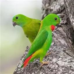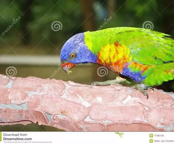 虹彩吸蜜鹦鹉(学名:Trichoglossus haematodus)共有21个亚种,体长25-30厘米,羽色鲜艳。体重120-130克。嘴为桔红色,脚为蓝灰色。头顶、下颌及脸颊部为深蓝色。枕部和颈上部有紫褐色和黄绿色的环带。背部、翅膀和尾羽为绿色。胸部为红色,并具有黑色的带状块斑,腹部、两胁为暗绿色,并有红色横斑,尾下覆羽为黄色。鸟喙比一般鹦鹉的长、更特别的是细长的舌头上有刷状的毛,称为刷状舌,方便该鹦鹉深入花朵中取得食物。常成群啁啾尖叫,叫声嘈杂。栖息在低地森林、开阔林地和公园中,以花粉和花蜜为食,也吃种子、果实和昆虫。 成对或集群活动。活泼好动,从一个树丛飞到另一个树丛。飞行呈直线,速度快。分布于澳大利亚,印尼,巴布亚新几内亚和所罗门群岛。