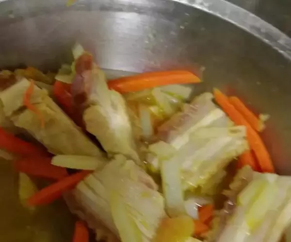 1.起锅放油放主料,配料煸炒出香味,放水适量中火煮5—10分钟,倒入。