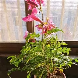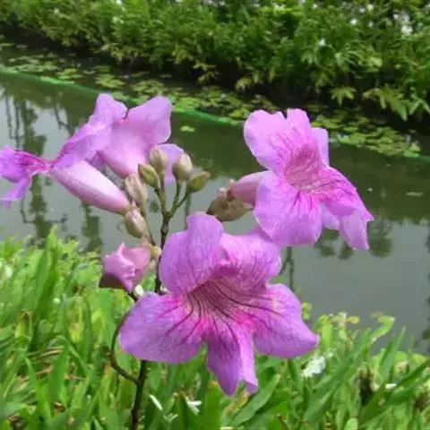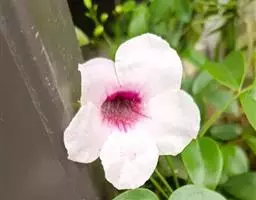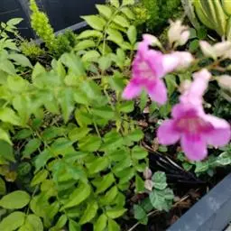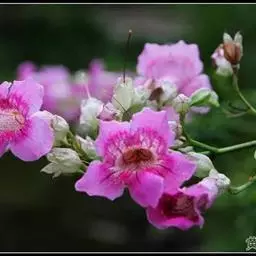 粉花凌霄 K.Schum.)是紫葳科魔盒凌霄属的落叶藤本植物。奇数羽状复叶对生,小叶全缘,…