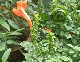 危害症状:白粉病侵染美国凌霄的枝叶和嫩梢,发病初期叶片着生黄色小斑点,随后逐渐增大并相互连接,病斑上着生一层白色粉状物,后叶片发生皱褶,凸凹不平,嫩梢扭曲,发病严重时影响生长,花小而色淡。