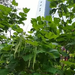 厚萼凌霄栽植前应对植株进行修剪,对主藤进行轻短截,主藤上着生的侧枝全部疏除,主藤萌发新枝后,在其上选择一个长势最壮、靠顶端较近的枝条做主藤的延长枝。待主藤延长枝长到一定高度后应及时搭设攀缘物进行牵引,使其尽早攀缘至棚架顶端,第二年早春对主藤延长枝进行轻短截,促发侧枝。主藤延长枝每侧保留3-4个侧枝,侧枝大致呈“丰”字形分布,第三年对侧枝进行轻短截,促生二级侧枝。按此方法修剪,再加上充足的水肥管理,藤蔓可很快铺满棚架。此后的修剪应着重对过密枝、重叠枝、病虫枝、干枯枝进行疏除,且勿使枝条重叠,否则会影响植株通风透光,引发病虫害。