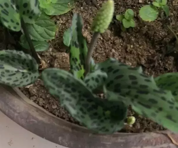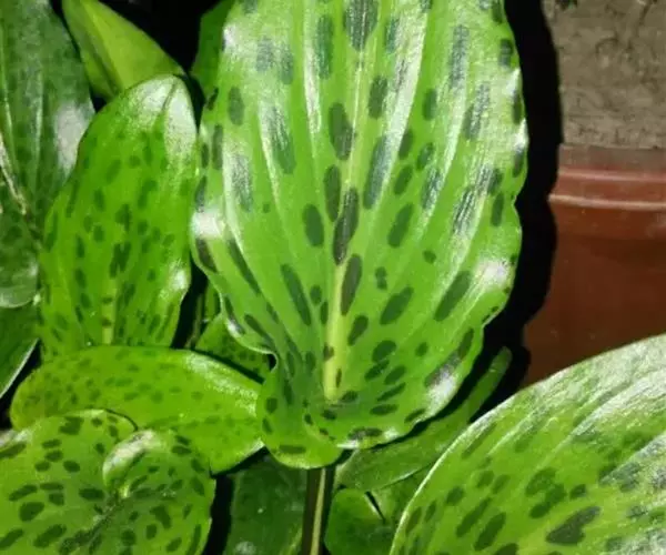 油点百合属于百合科的多年生草本植物,别称是豹纹红宝。原产于南非。株高约10-15公分,紫红色的茎肥大呈酒瓶状,茎顶着生3-5片肉质叶子,叶银绿色并具有不规则的斑点,叶背紫红色。花期春夏季,圆锥花序,小花绿色,约0.3公分,花瓣6枚,基部聚合呈钟型,雄蕊为紫红色。栽培需要有充足的光照。