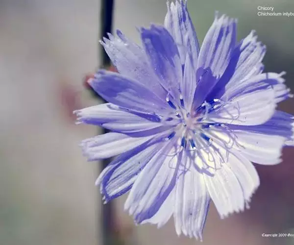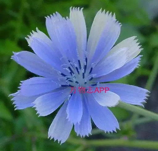 1、毛菊苣:茎呈圆柱形,稍弯曲;表面灰绿色或带紫色,具纵棱,被柔毛或刚毛,断面黄白色,中空。叶多破碎,灰绿色,两面被柔毛;茎中部的完整叶片呈长圆形,基部无柄,半抱茎;向上叶渐小,圆耳状抱茎,边缘有刺状齿。头状花序5~13个成短总状排列。总苞钟状,直径5~6mm;苞片2层,外层稍短或近等长,被毛;舌状花蓝色。瘦果倒卵形,表面有棱及波状纹理,顶端截形,被鳞片状冠毛,长0.8~lmm,棕色或棕褐色,密布黑棕色斑。气微,味咸、微苦。
